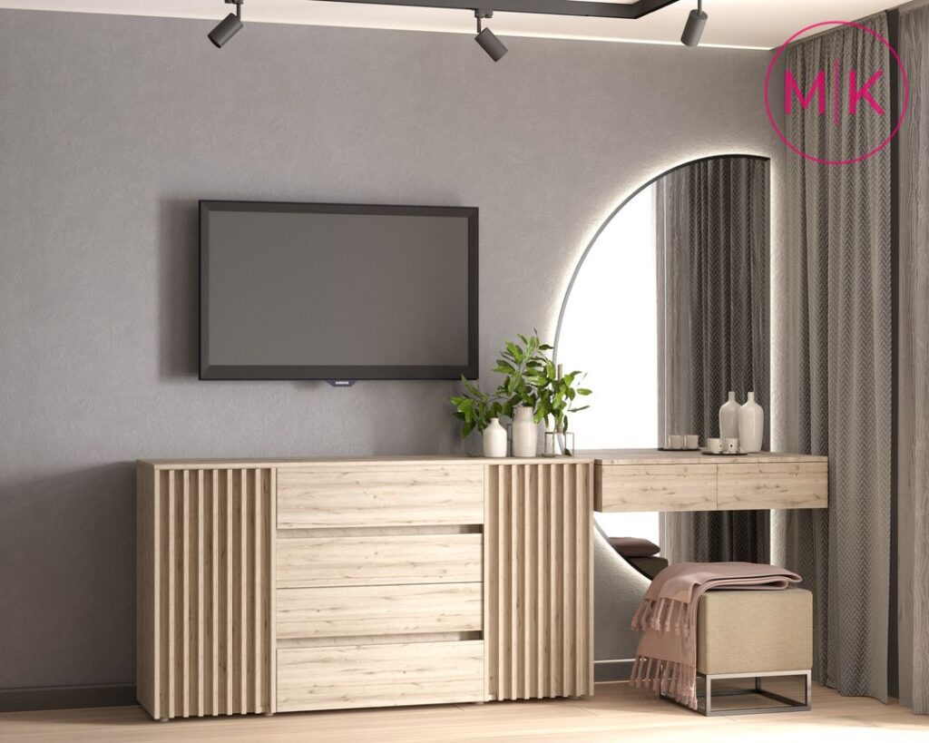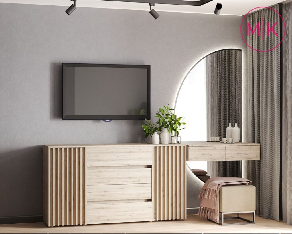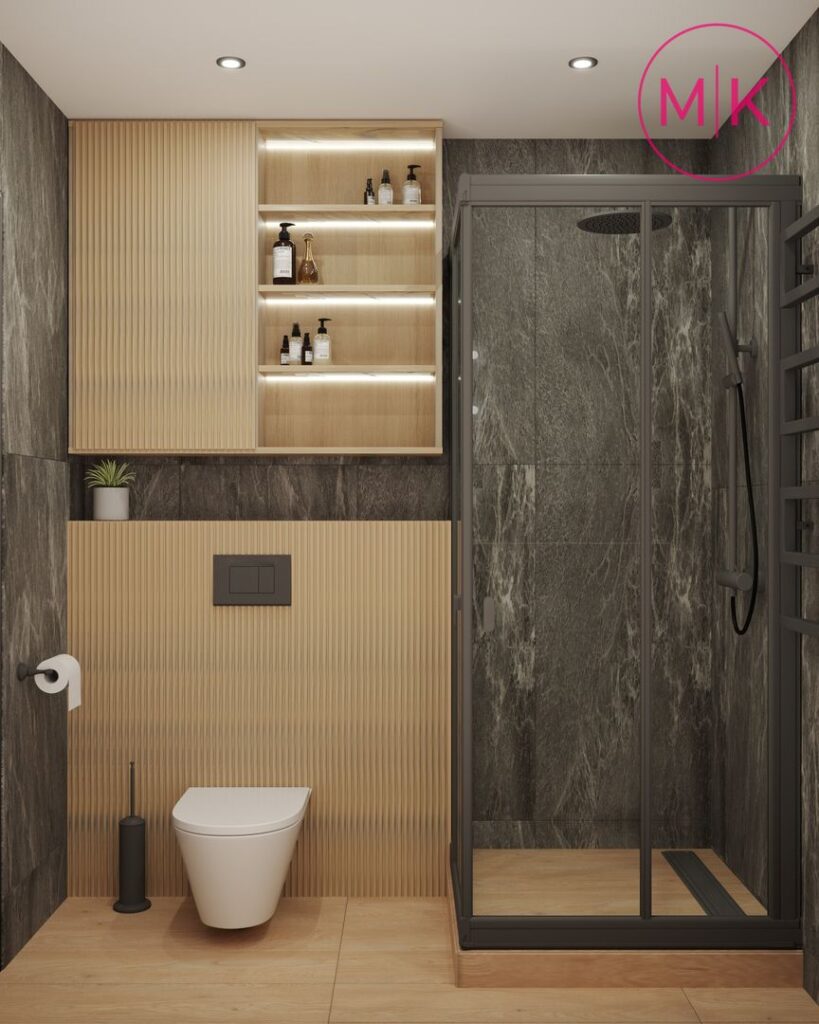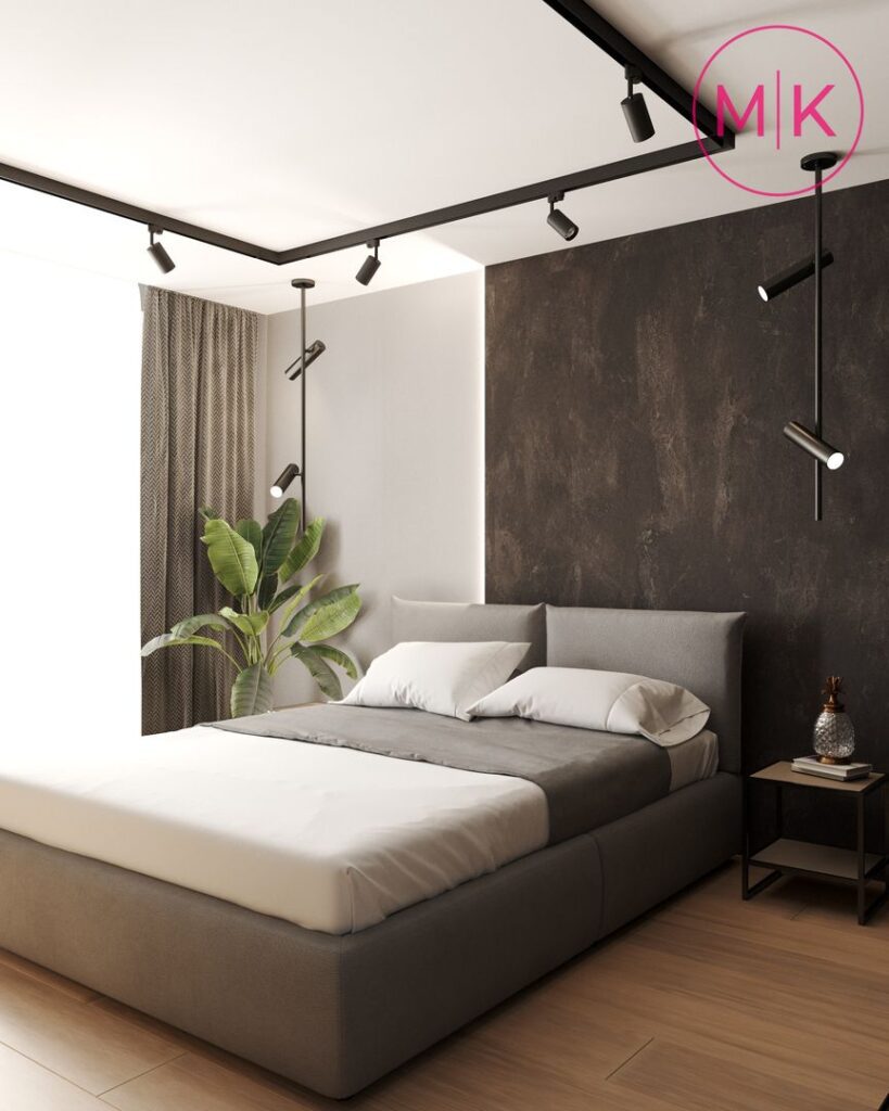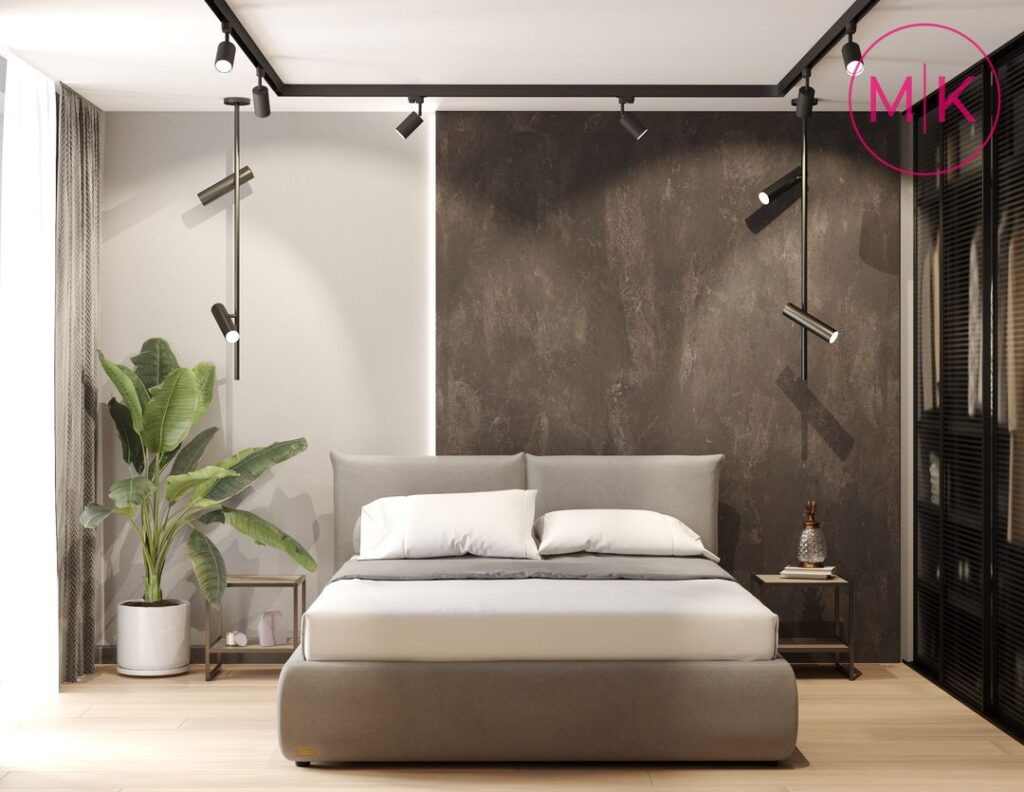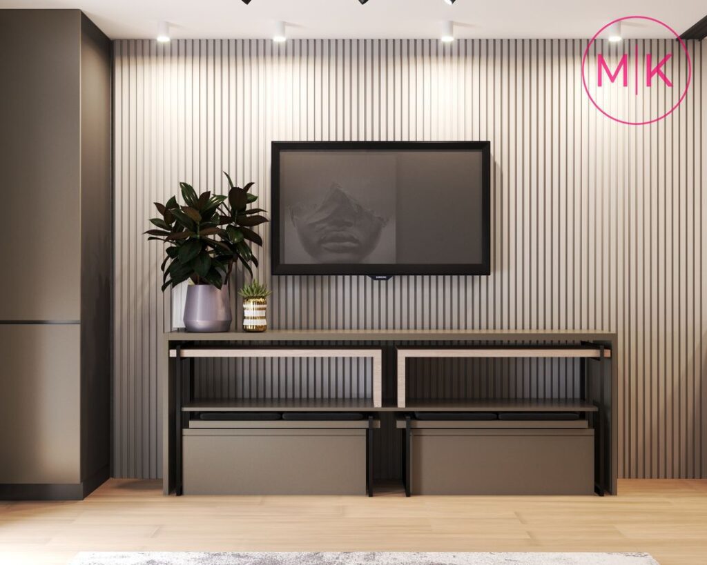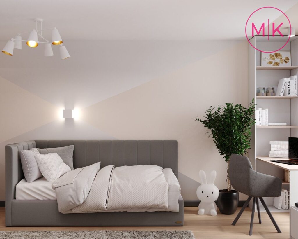 Для оздоблення стін ми використали пофарбування під колір, декоративні панелі, декоративну штукатурку для акценту у спальні, у санвузлі – керамограніт.