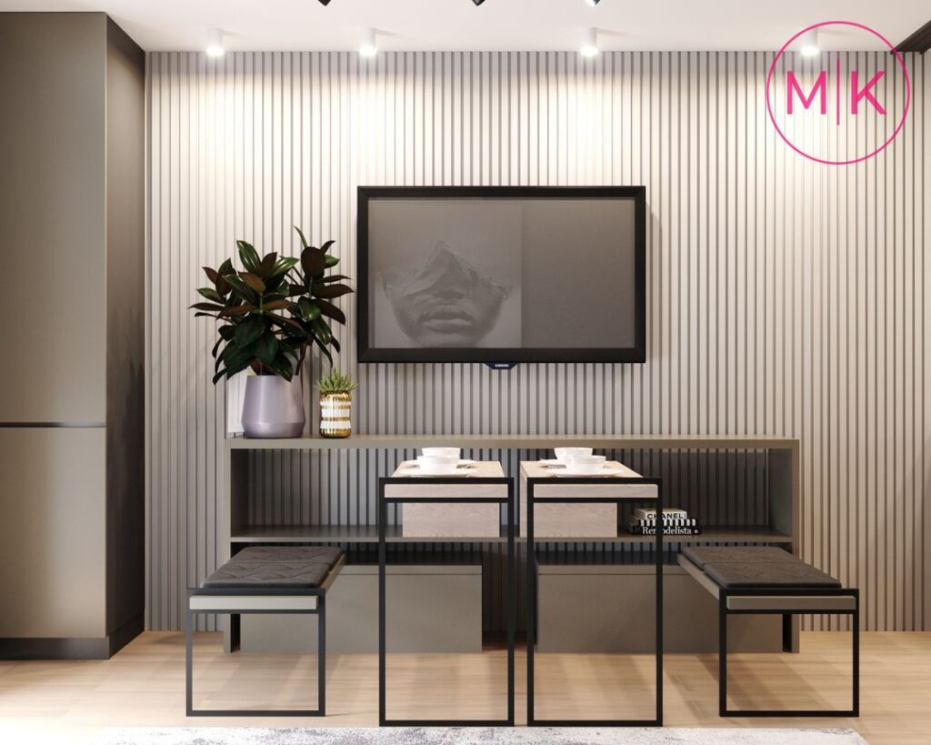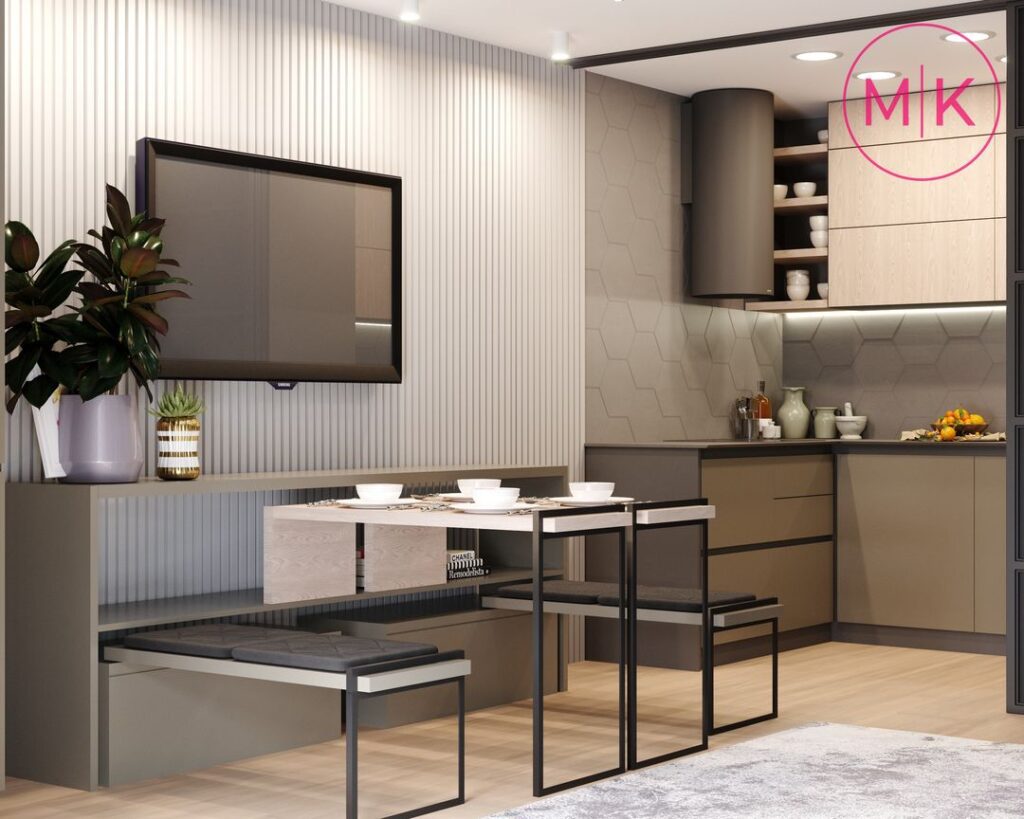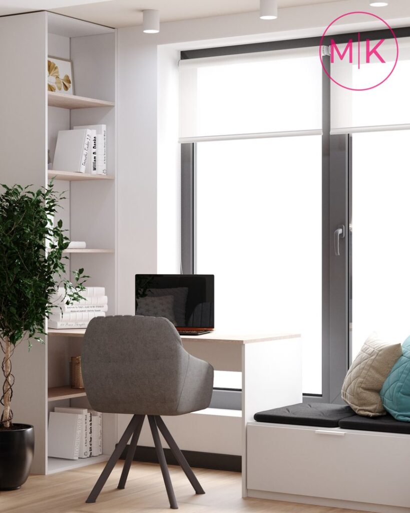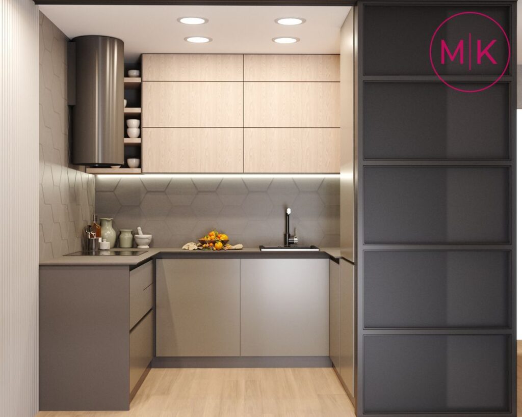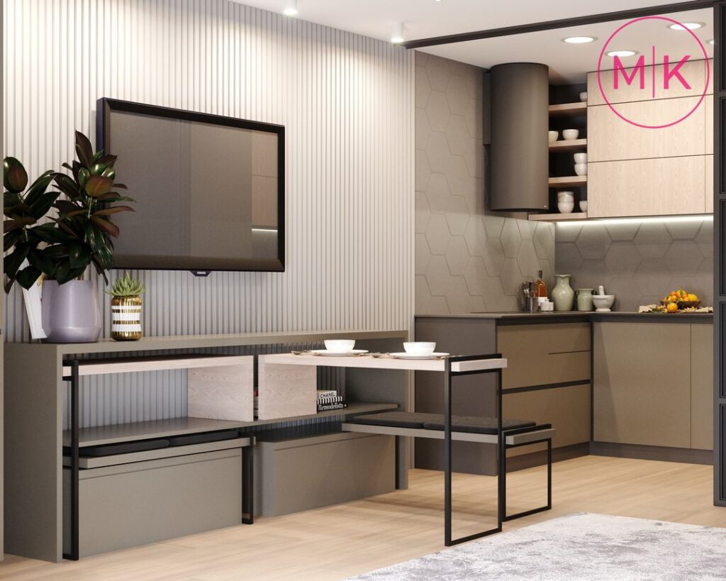 Проект передбачав демонтаж стін, щоб відокремити дитячу кімнату та кухню- вітальню. Кухню можна також відділити за бажанням скляною розсувною перегородкою. У вітальні ми розмістили великий кутовий диван, журнальний столик та пенал для котла. А ви бачили стіл-трансформер!? Він легко розкладається та зручний для використання.