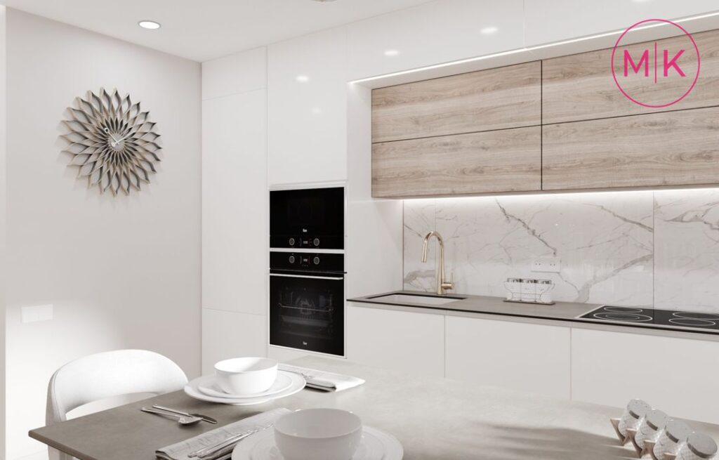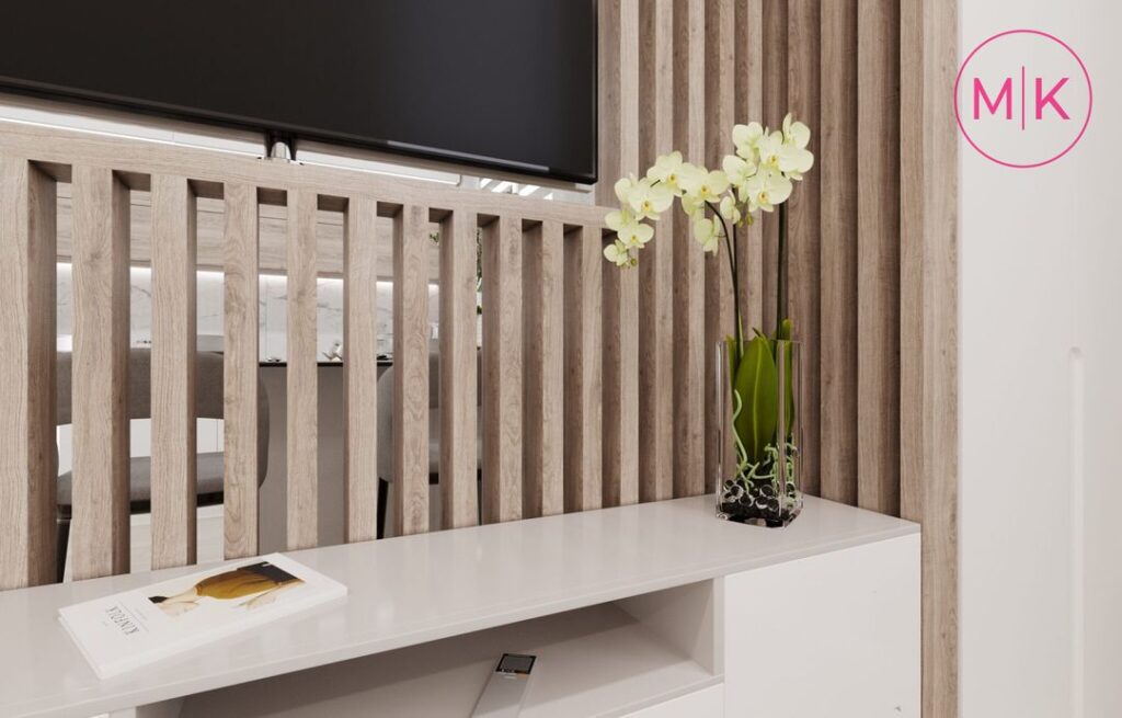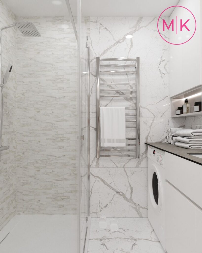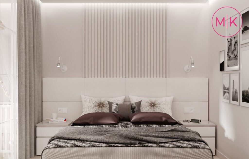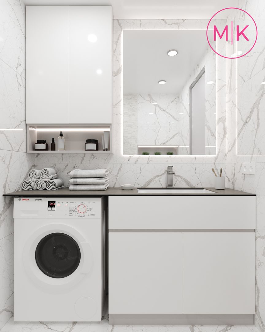 Проект передбачав демонтаж стін. Підлогове покриття кварц-вініл в зонах кухні, вітальні та спальні. В приміщенні санвузла передбачалося влаштування підлоги з керамограніту з гідроізоляційною підкладкою із заведенням на стіни на 200 мм. від рів. ч. п. Оздоблення стін передбачало такі покриття як матове пофарбування, гіпсові панелі, декоративна штукатурка, керамограніт. Влаштування стелі з ГКЛ – з нішею під штори та світлодіодну підсвітку та з ГКЛВ у санвузлі, пофарбування стелі – колір білий.