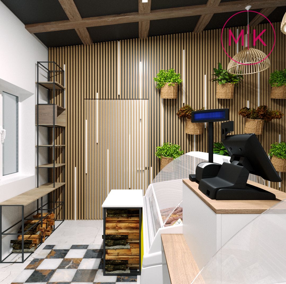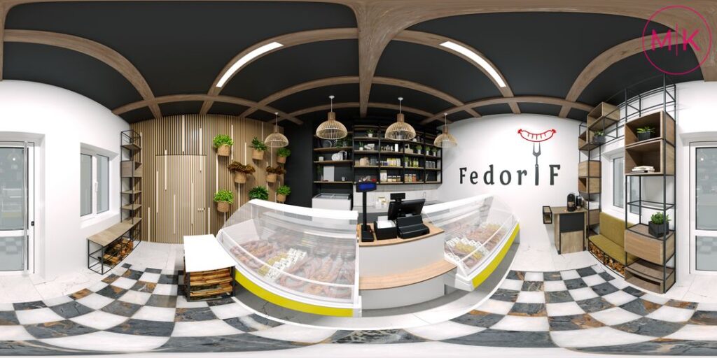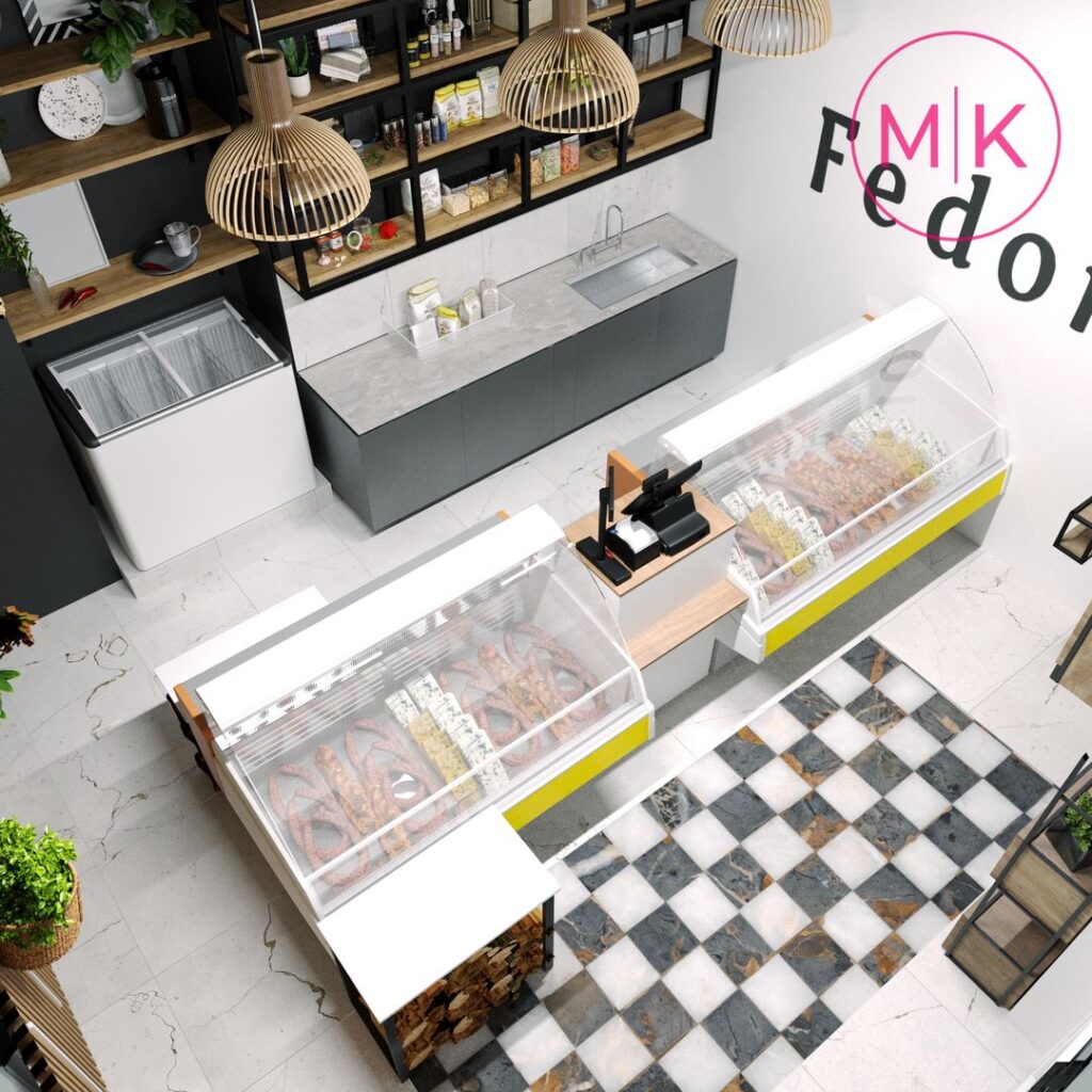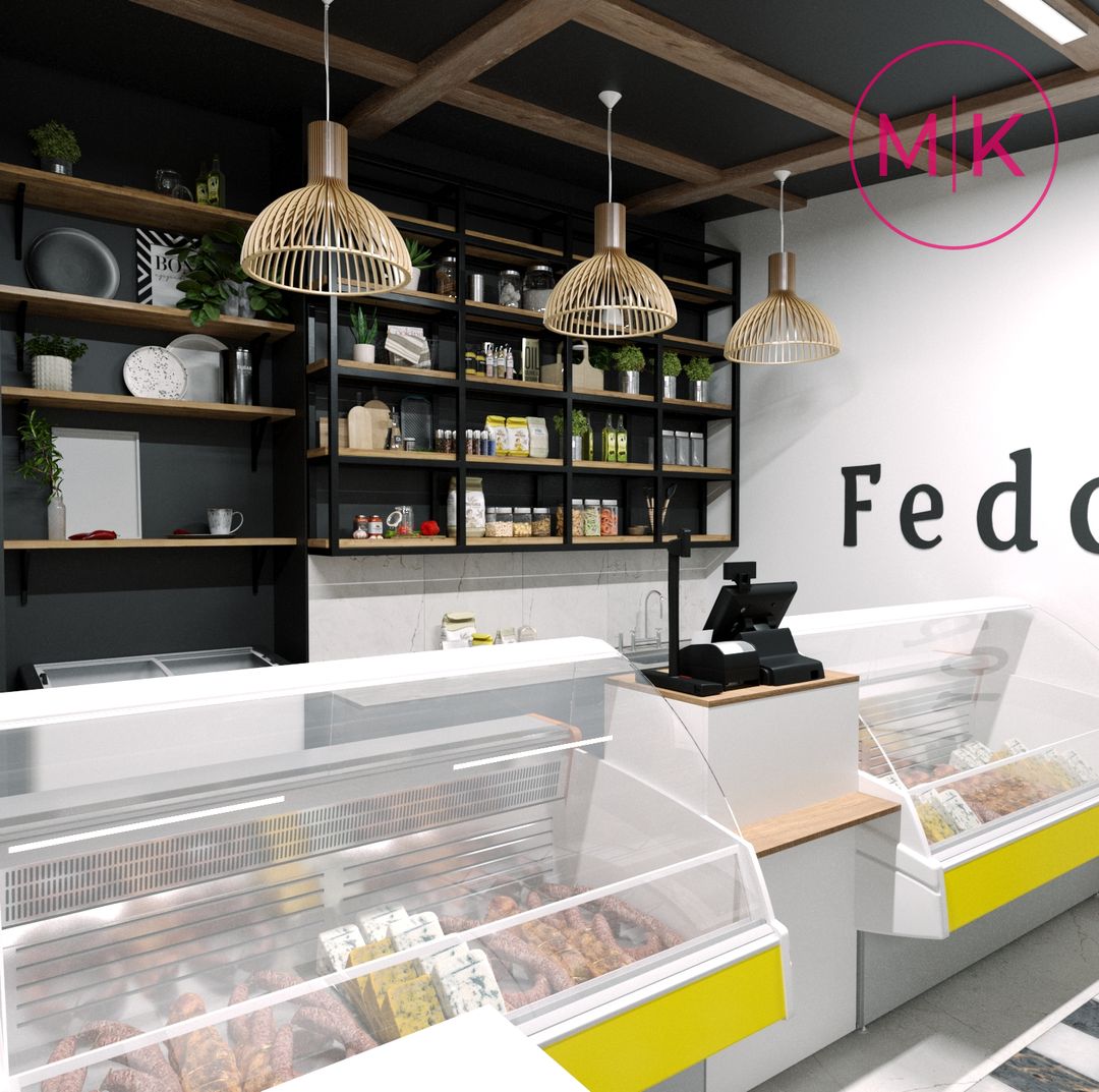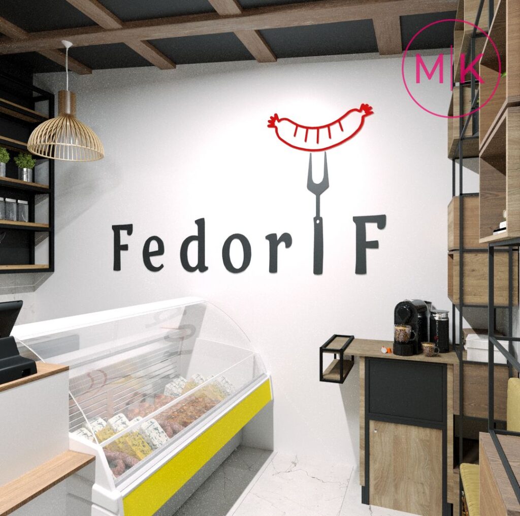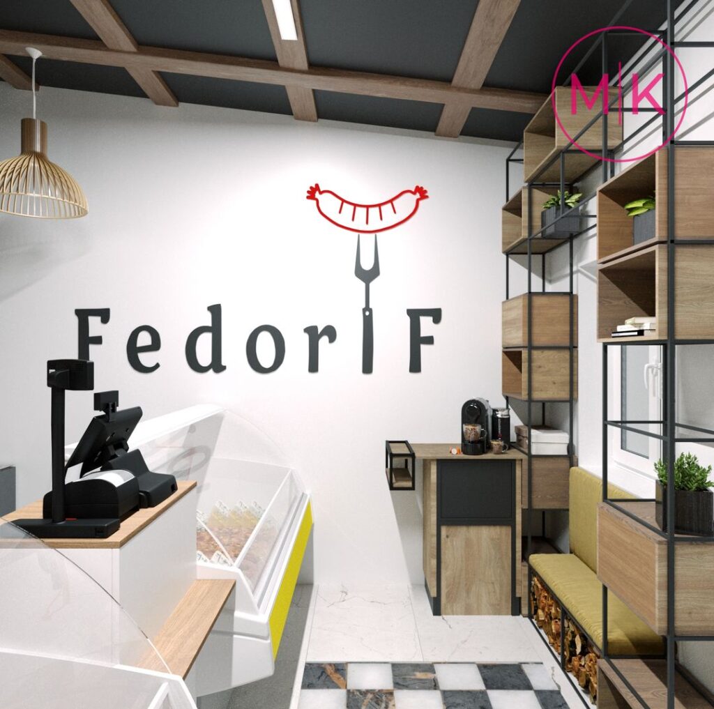 Даний магазинчик за площею лише 40 кв. м., але у нас получилося досить функціонально розпланувати та отримати зони, самообслуги, зони відпочинку з м’яким місцем та кавовим апаратом, та зоною обслуговування клієнтів. Все це візуально в поєднанні з природнім декором, фірмовим стилем та логотипом FedoriF