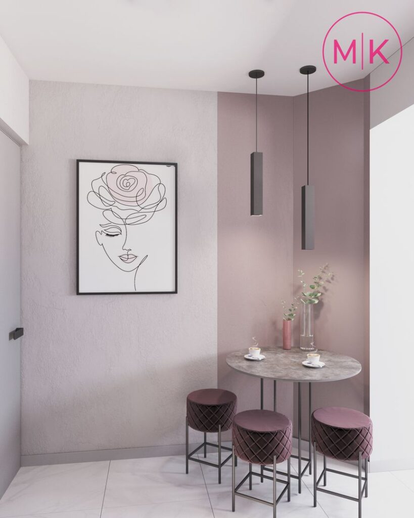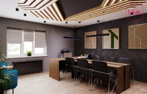 Проект передбачав демонтаж стін та зведення нових перегородок та дерев’яних рейок пофарбованих у тон стін, розмежування простору на зони надання послуг. Оздоблення стін передбачало пофарбування зносостійкою фарбою та декорування штукатуркою Cadoro, а також декоративними 3Д панелями.