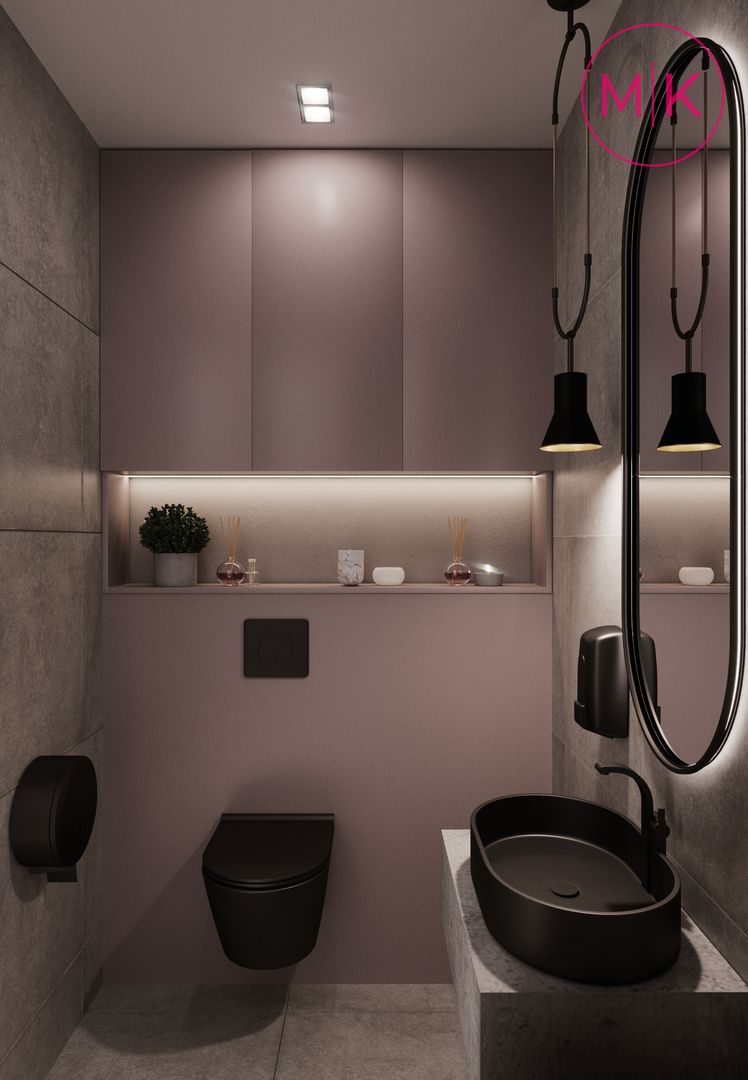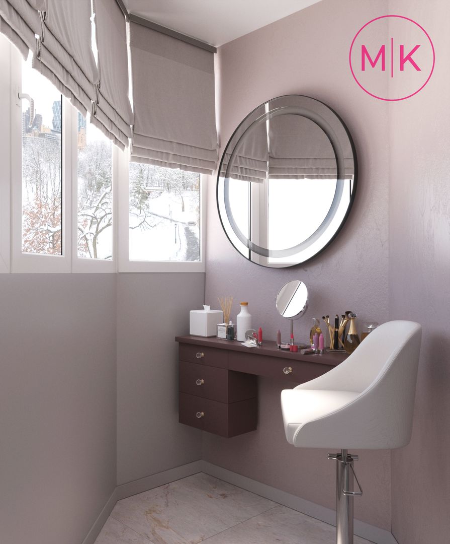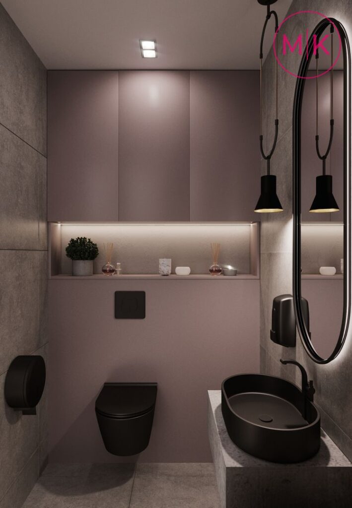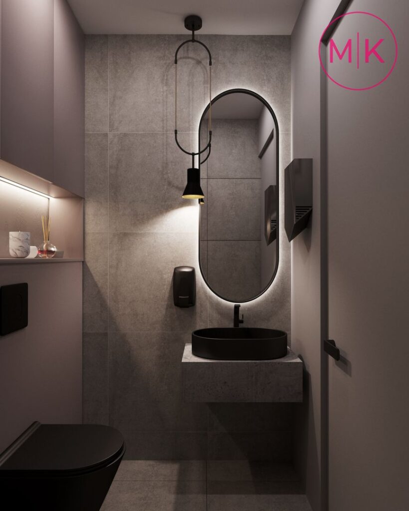 Особливу увагу приділили сценаріям освітлення. Використано профіль з лед підсвіткою у декоративних гіпсових панелях, та підсвітку логотипу салону. Центральним елементом є динамічна люстра з розкинутими скляними плафонами по всій довжині основи, що надає особливого шарму простору. В основному залі використані елегантні підвіси у мінімалістичному дизайні, що створюють відчуття невагомості та легкості. У санвузлі продумано акцентний сценарій освітлення : лед підсвітка ніші над інсталяцією, підсвітка дзеркала незвичної форми та підвіс, що дублює форму дзеркала. Матеріали фасадів меблів : МДФ фарбований, стільниця фундермакс.