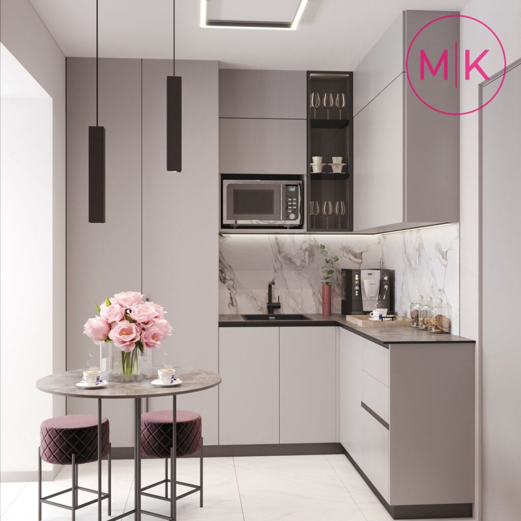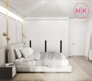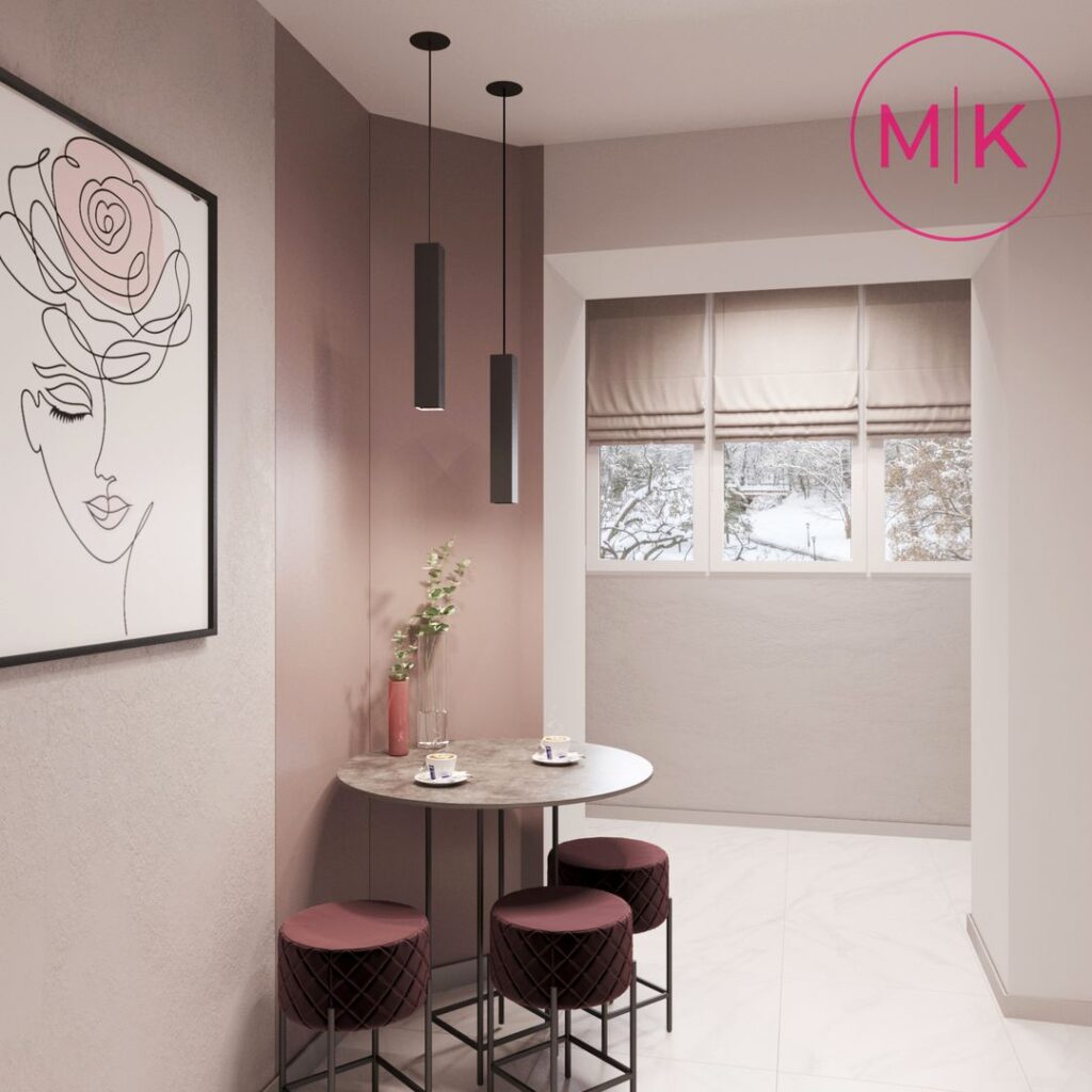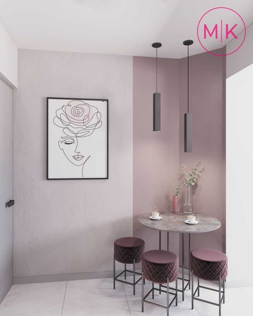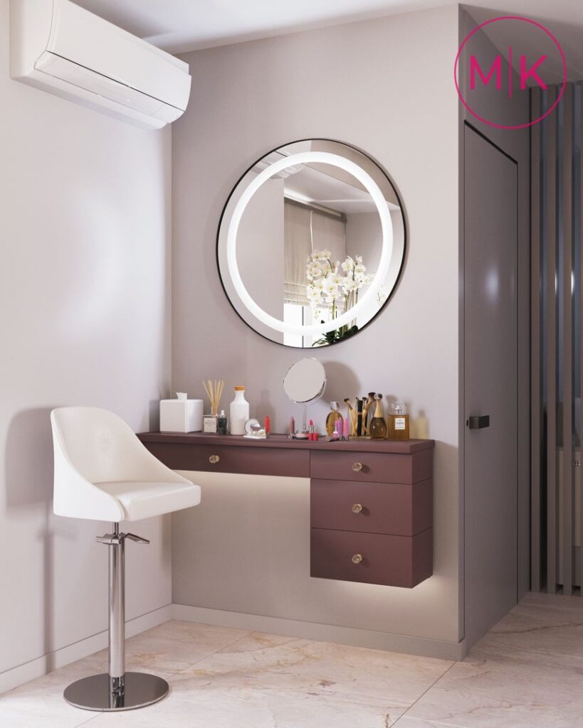 Особливу увагу приділили сценаріям освітлення. Використано профіль з лед підсвіткою у декоративних гіпсових панелях, та підсвітку логотипу салону. Центральним елементом є динамічна люстра з розкинутими скляними плафонами по всій довжині основи, що надає особливого шарму простору. В основному залі використані елегантні підвіси у мінімалістичному дизайні, що створюють відчуття невагомості та легкості. У санвузлі продумано акцентний сценарій освітлення : лед підсвітка ніші над інсталяцією, підсвітка дзеркала незвичної форми та підвіс, що дублює форму дзеркала. Матеріали фасадів меблів : МДФ фарбований, стільниця фундермакс.